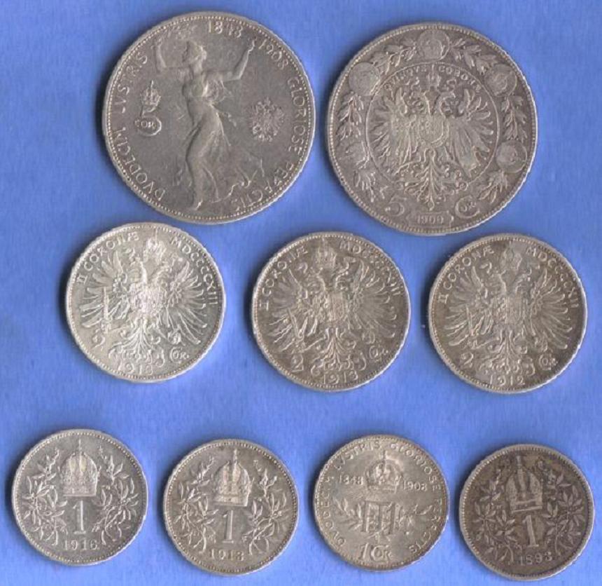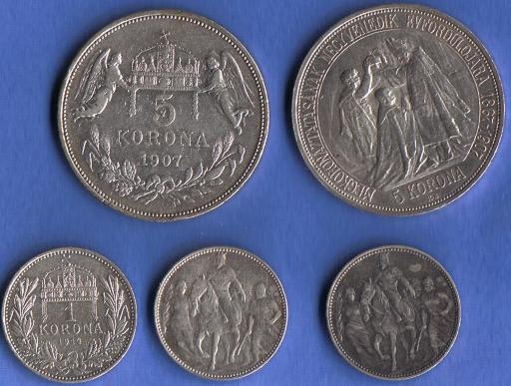 Im Jahr 1892 wurde im Kaiserreich die Kronenwährung eingeführt (1 Krone = 100 Heller). Die 1 Kronen Münzen wurden aus 836er Silber (5 Gramm, Ø 23mm) ab 1892, die 2 Kronen Münze ab 1912 ebenfalls aus 836er Silber (10g., Ø 27mm) und ab 1900 die 5 Kronen Münze aus 900er Silber (24g., Ø 36mm) in beiden Reichshälften geprägt.