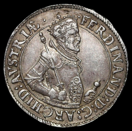 Erzherzog Ferdinand, 1564-1595. Reichstaler o. J., Ensisheim. Av. Gekröntes Hüftbild des Erzherzogs r. mit Tulpenzepter (auf Ende von [AE]) und Harnisch mit Rankenornament, Umschrift . FERDINAND : D(ei) : G(ratia) : ARCHID(ux) : AVSTRIAE . Rv. Erzherzoghut über quadriertem Wappen mit Mittelschild Oberelsaß in Toisonkette zwischen den Schilden Habsburg und Pfirt. Umschrift DVX . BVR(gundiae) . LA(ndgravius) . ALS(atiae) . CO(mes) . FER(ti). (28,52 g, 39,5 mm).