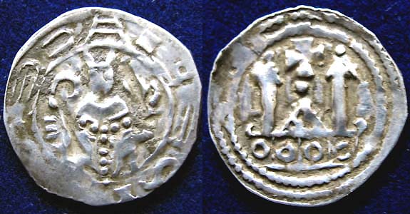 Rv. Bischof Brustbild zwischen Türmen mit Kringel und Punkten, über dem Haupt Kreuz, doppelter Punktkranz