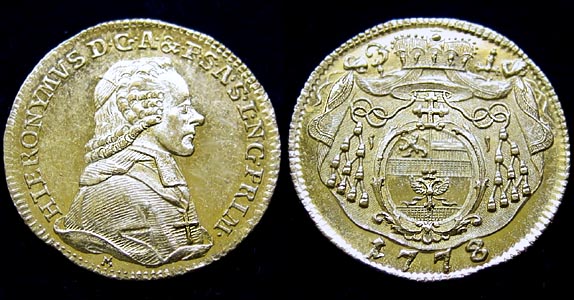 Dukat geprägt in Salzburg 1778 Av. Brustbild Fürsterzbischof Colloredo rechts Rv. Salzburger Wappen mit den Insignien des Fürsterzbischofs 21,3mm 3,48g Probszt 2393 Ex: moneta auf moneta.at (tolle Plattform und klasse Münzen!)