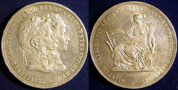 Als Beispielstücke anbei 1-Gulden zur Vermählung von Kaiser Franz Joseph I. und Elisabeth Amalie Eugenie (auch Sisi oder Sissi genannt) zweite Tochter von Herzog Max Joseph in Bayern am 24. April 1854 in der Augustinerkirche in Wien und das 2-Gulden Stück zum Hochzeitsjubiläum 1879.
