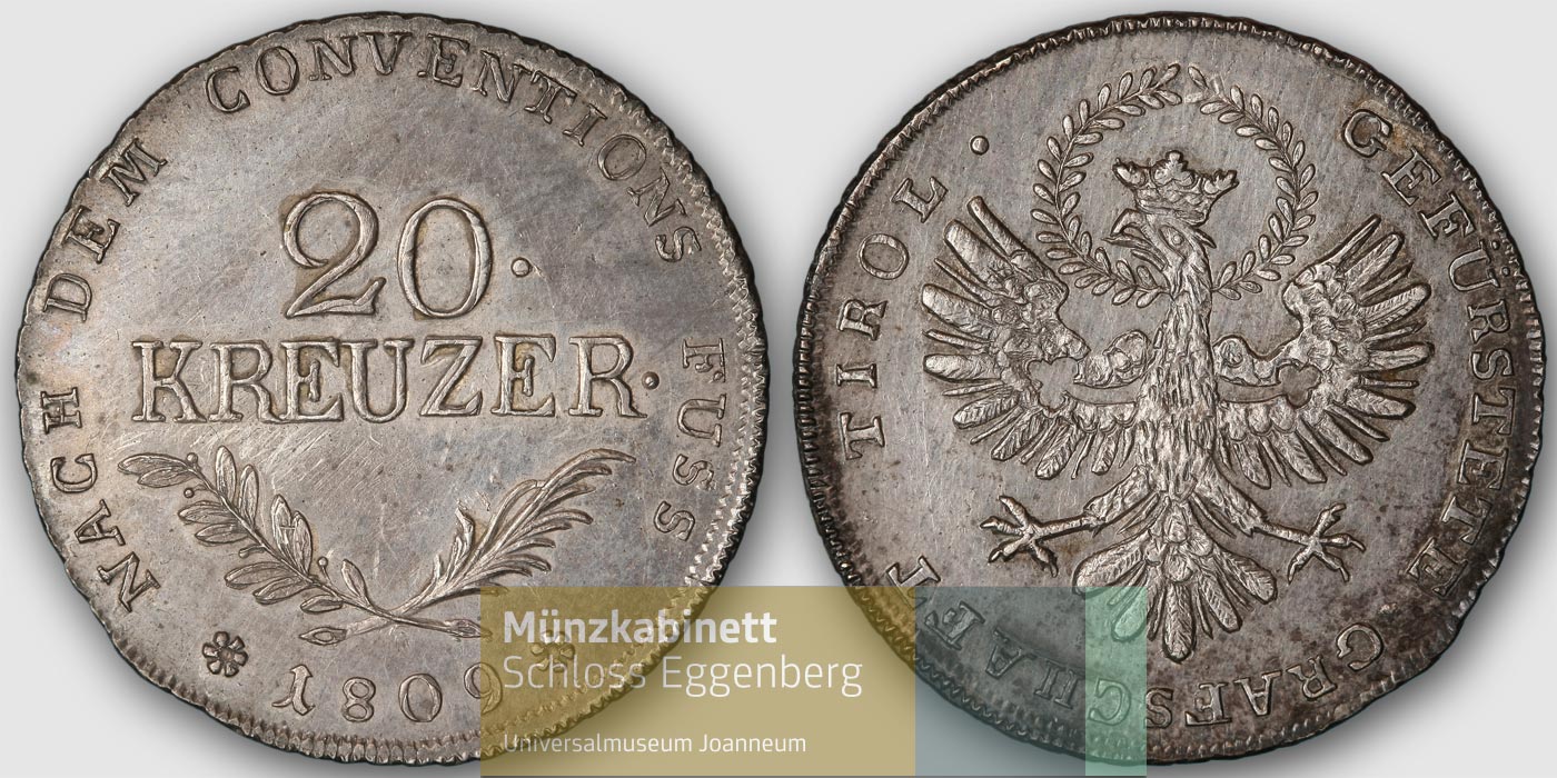 Bitte keinen neuen Tiroler Freiheitskampf beginnen! Heute sind ja unsere germanischen Nachbarn willkommene Gäste. Ich habe meinen Andreas-Hofer-Zwanziger aus Tirol bekommen. Das war gewissermaßen Entwicklungshilfe für das münzarme Oberösterreich. Es ist auch die Variante mit den vertieften Kleeblättern und sie hat nach "gefürstete" keinen Punkt (wäre ja auch unlogisch).