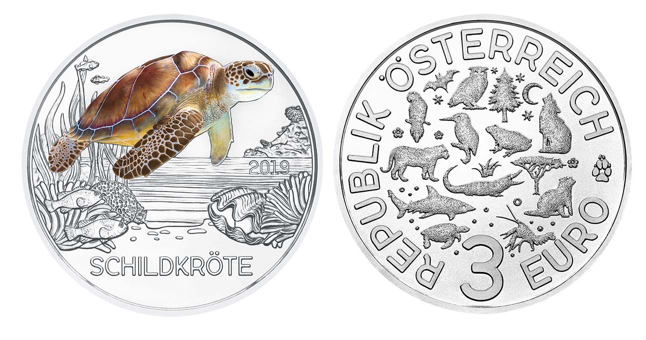 Die Wertseite des 3-Euro-Tier-Talers „Schildkröte“ (Buntmetall, Auflage 50.000 Stück) zeigt im Stil eines Scherenschnittes die Tiere der zwölfteiligen Serie. Auf der anderen Münzseite ist eine farbige Schildkröte zu sehen, die im Dunkeln nachleuchtet. 2019 erscheinen zu dieser Serie noch die folgenden Motive: Fischotter, Flusskrebs Der empfohlene Detailpreis ist € 9,90 (inkl. 20 % USt.) 3-Euro-Tier-Taler Sammelalbum: Ausgehend von den zwölf Tier-Talern kann man im reich illustrierten Sammelalbum viel Interessantes und Spannendes erfahren. Auf der Titelseite trägt das Sammelalbum ein faszinierendes Wechselbild, das je nach Blickwinkel einen Tiger, eine Eule oder einen Hai zeigt. Empf. Detailpreis: 15,40 Euro (inkl. 10 % USt.)