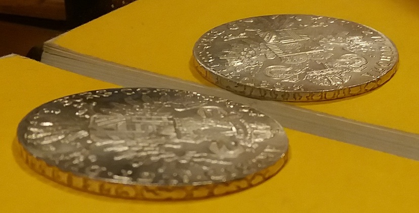 Je nach dem wie die Ronde dann in der Münzprägemaschine zwischen den Prägestempeln landet (der Vorgang ist automatisch!), ist die Schrift mal von einer, mal von der anderen Seite her zu lesen. Das sind aber keinstenfalls verschiedene Varianten. Es handelt sich einfach um einen Zufall und statistisch sind die Stücke auch ziemlich genau gleich oft vorhanden.
