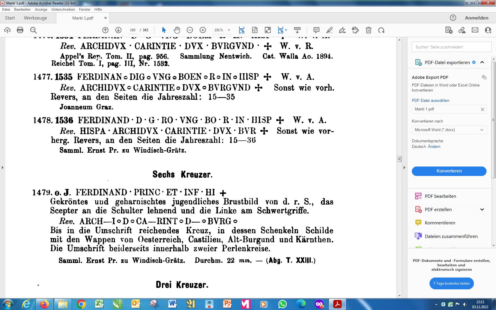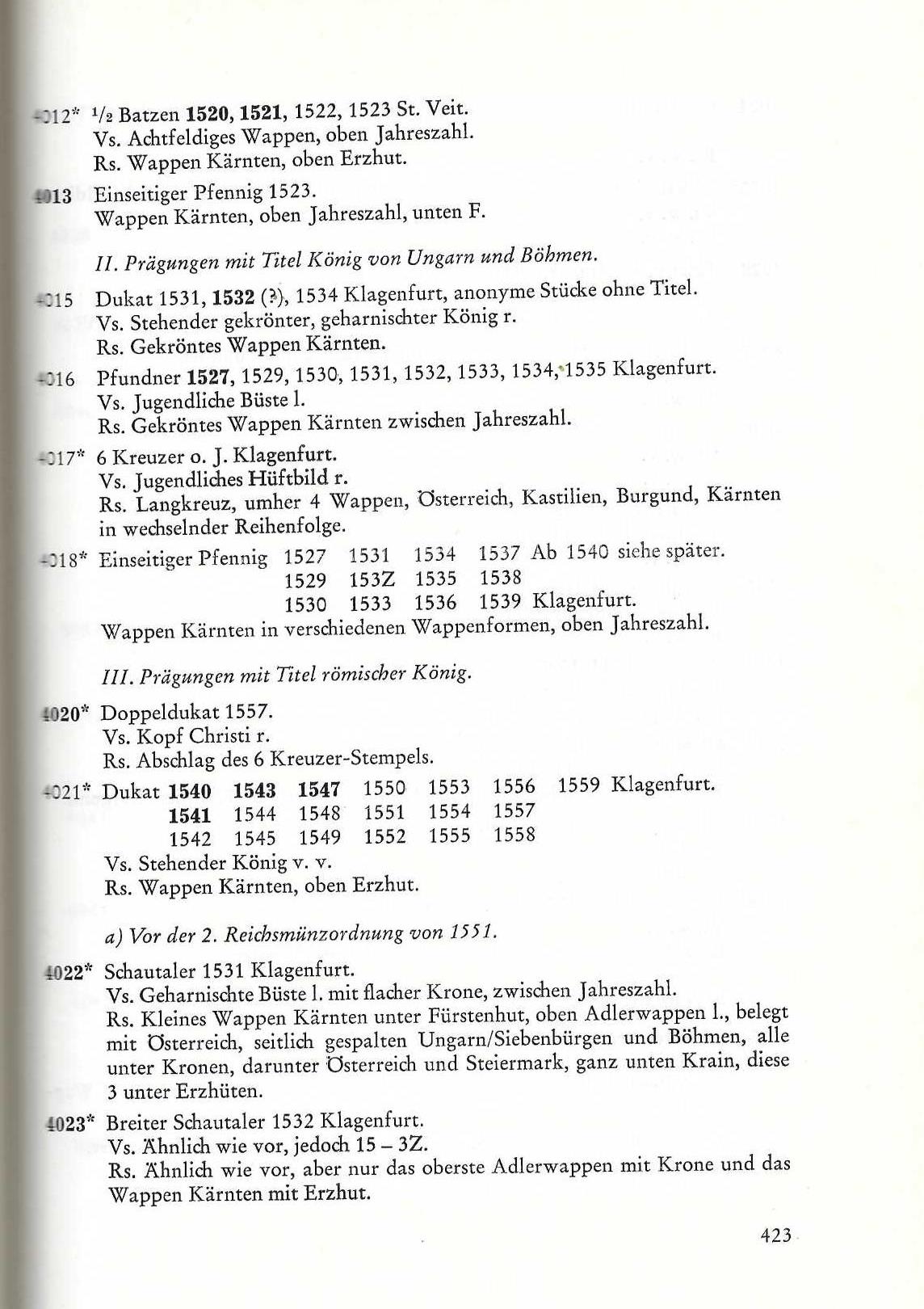 ich habe die mir zur Verfügung stehende Literatur (Markl, Schulten, Hippmann und Saurma) durchgesehen und nirgends die ungeteite Umschrift (CARIN) gefunden. Markl führt den Sechser unter 1479 (als Bild 1579!) an, Schulten zeigt nur ein Bild unter Nr. 4017; bei Nr. 4011 findet sich leider kein Bild. Möglicherweise handelt es sich hier um diesen Sechser mit ungeteilter Umschrift. Wenn man den Werdegang Ferdinands I. betrachtet, dann ergeben sich folgende zeitliche Fixpunkte: