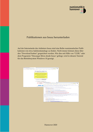 Auf der Internetseite des Anbieters Issuu sind eine Reihe numismatischer Publikationen wie etwa Auktionskataloge zu finden. Nicht immer lassen sich diese via „download“ speichern. Wie dies mit Hilfe von „CURL“ oder dem Programm „Descargar libros desde Issuu“ gelingt, wird in diesem Tutorial für das Betriebssystem Windows 10 gezeigt.