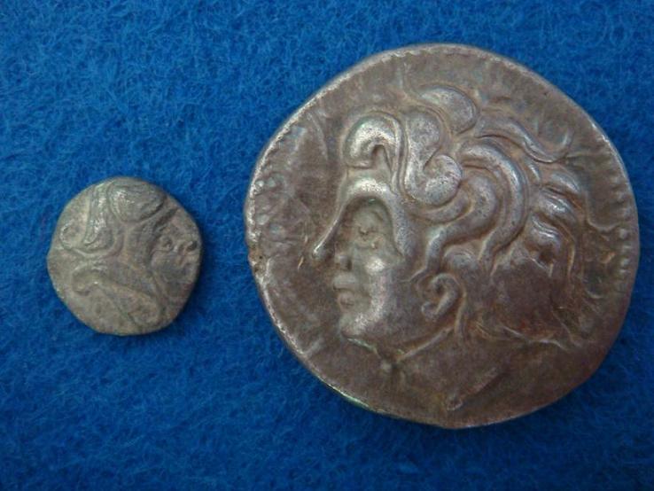Das Kleinsilber zeigt meiner Meinung einen Kopf mit Helm und Helmkappe, welcher beim Großsilber fehlt.
