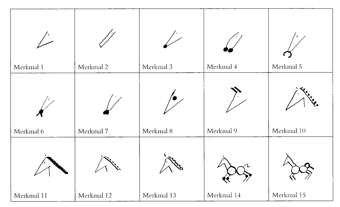 Untergruppe 15: Drei Punkte über dem Pferd, unter dem Pferd nach unten offener Torques mit Punkt.