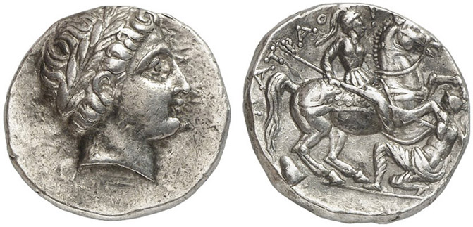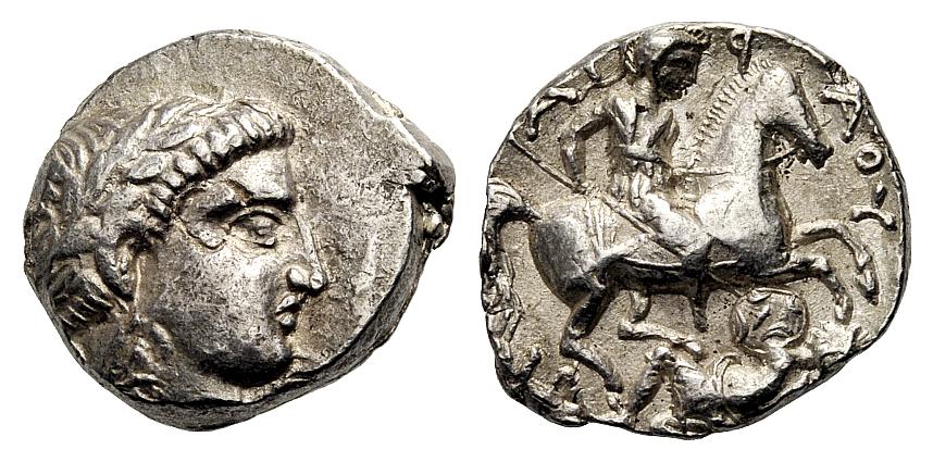 http://www.acsearch.info/record.html?id=701692Allerdings hat der "jugendliche Kopf" bei den meisten Patraos Tetradrachmen das Auge naturgetreu von der Seite dargestellt, während es bei der vorgestellten Münze eher von vorne gesehen (und im Profil ziemlich merkwürdig) wirkt: