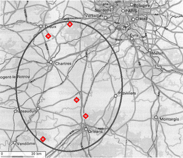 Nach Nicolas Manios kommen diese Achtelstatere im Gebiet südwestlich von Paris, bzw. zwischen Orléans und Dreux vor (Karte des Aufsatzes von N. Manios, Fundpunkte rot hervorgehoben):