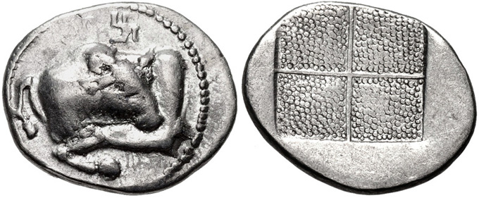 MACEDON, Akanthos. Circa 470-390 BC. AR Tetrobol (17mm, 2.42 g). Forepart of bull left, head reverted; Π and swastika above / Quadripartite incuse square with granulated recesses. SNG ANS 52.