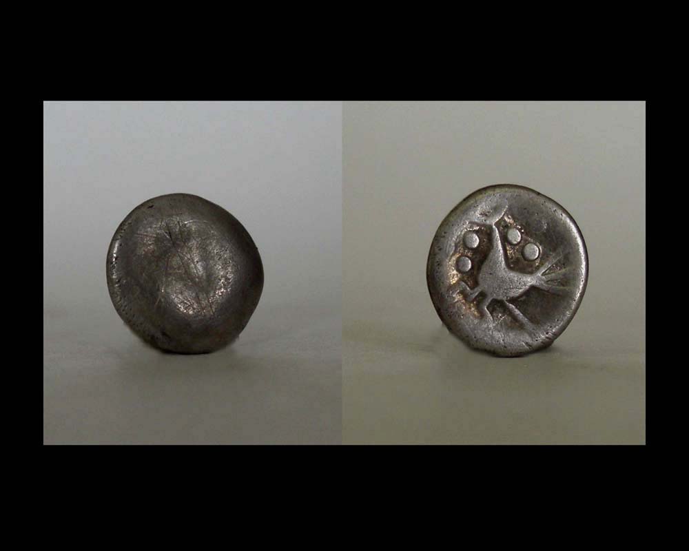 Drachme Typ Zemplin Av: Kopf mit helmartiger Kopfbedeckung nach rechts, bogenförmiger Halsabschnitt, Kugelauge, Kugelmund, alles im Perlrand. Leicht geschüsselter Schrötling aus hochwertigem Silber. Rv: Vogelpferd links (müder Stempel)