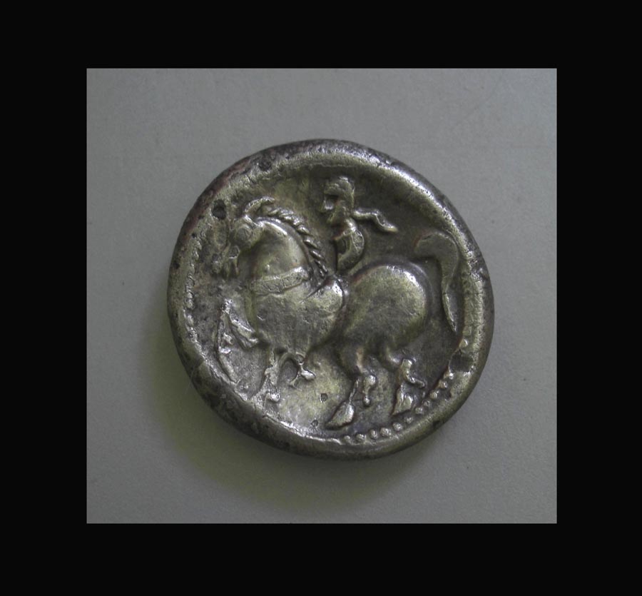Rv: Korpulentes gezügeltes Pferd trabt links, rechter Vorderlauf stark angewinkelt. Reiter mit langem Haarzopf und angewinkeltem Oberarm lehnt sich zurück. Am Pferdehals über dem Zügel,unter der Mähne und über dem Pferderücken je eine Kugel.