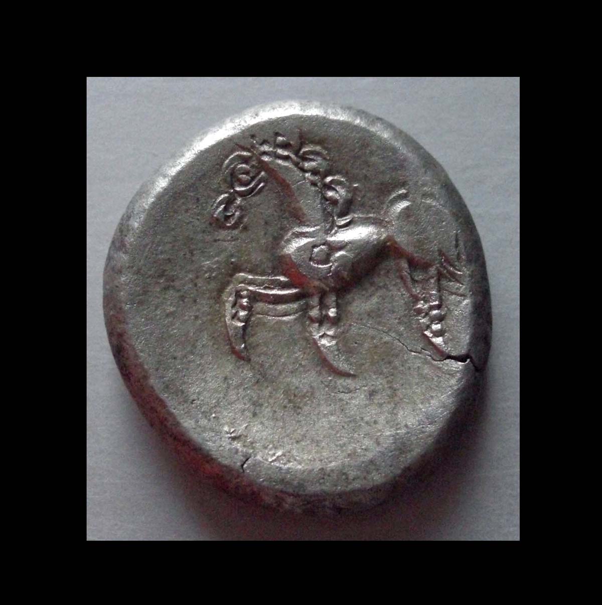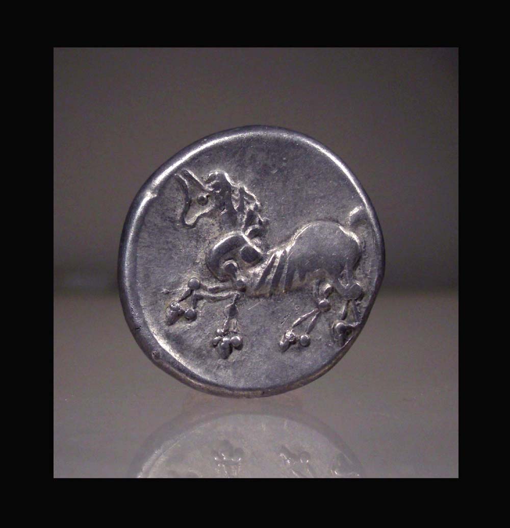 Rv.: Pferd mit senkrechten Messerhufen links. Die Mähne in mehreren Bögen abgesetzt, der Schweifin 3 langen Strähnen herabfallend, unter dem Schweifansatz Kugel. Der Kopf zeigt beginnende Achterform, der Vorderlauf stark angewinkelt.