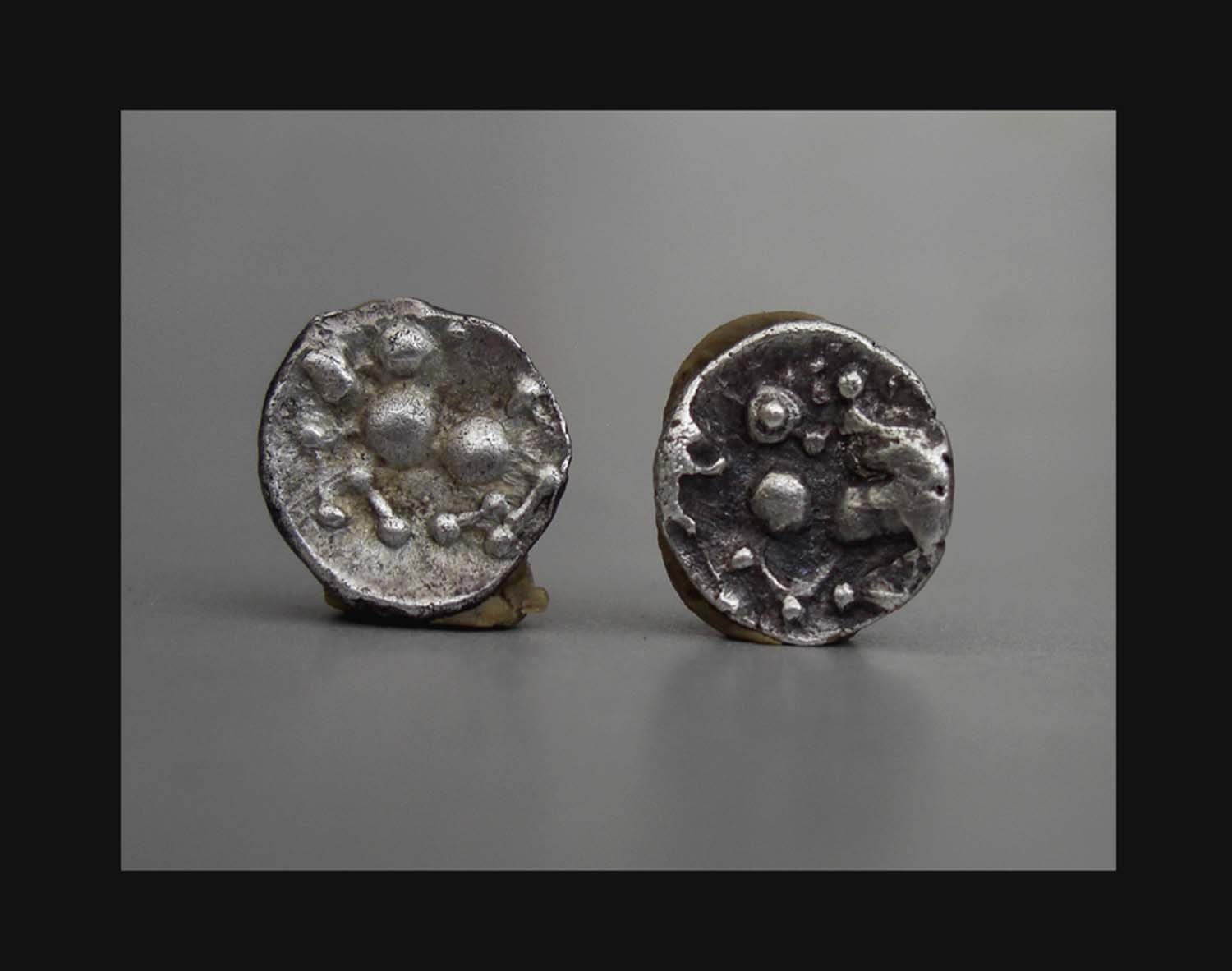 Rv.: Stark stilisiertes Pferd mit zurückgewandtem Kopf nach links, in Feldern bei 6 Uhr und 9 Uhr Stempelschäden.