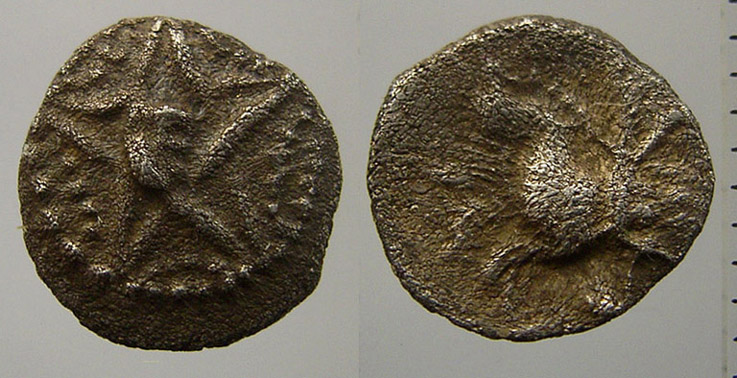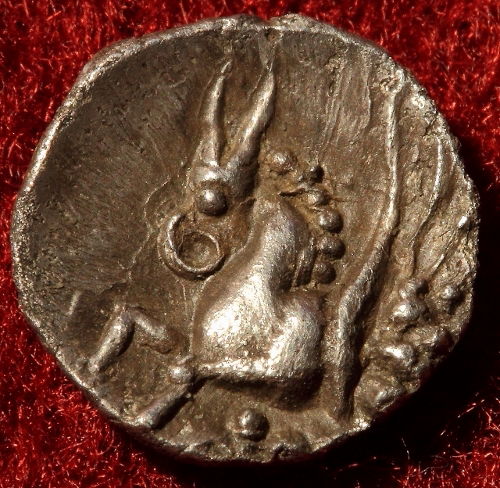 Hier wäre ein Exemplar, bei dem der Reversstempel so müde war, dass der Kopf des Pferdes in Streifen aufgelöst zu sein scheint und auf der Mähne des Pferdes scheinbar zwei bogenförmige Ornamente sichtbar sind: