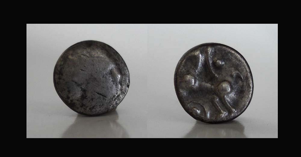 Die Variante J13 zeigt auf dem Avers einen rechtsgerichteten Kopf, auf dem Revers ein Pferd nach links. Darüber ein nach links geschwungener Bogen, darunter Leier mit Mittelpunkt, eine Darstellung ähnlich wie bei der ersten hier vorgestellten Münze. Leider wurde das Reversbild mit einem abgenützen Stempel geschlagen.