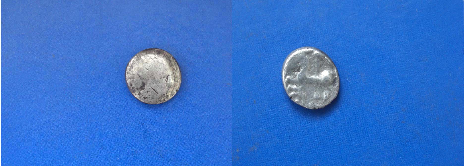 Das subaerate Kleinsilber ist ein später Typ II (aufgelöste Form mit deutlichen Kugelgelenken) - Pferd nach links - ist aber durch die Abplatzungen der Silberhaut nicht so schön erkennbar.