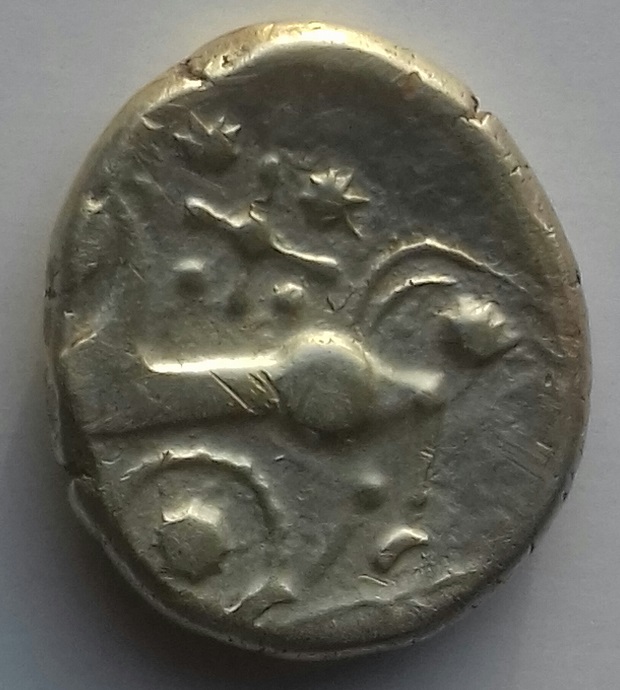 Es gibt einen zweiten Typen mit gleicher Rückseite (Pferd springt über Wellen und Lyra, darüber Sonne), aber normalem Apollokopf. Ich gehe davon aus, das mein Exemplar dem eben genannten folgte, zeitgleich mit der Ausgabe der Quinare. Gebe auch davon aus, dass der Stempel Schneider der gleiche war...