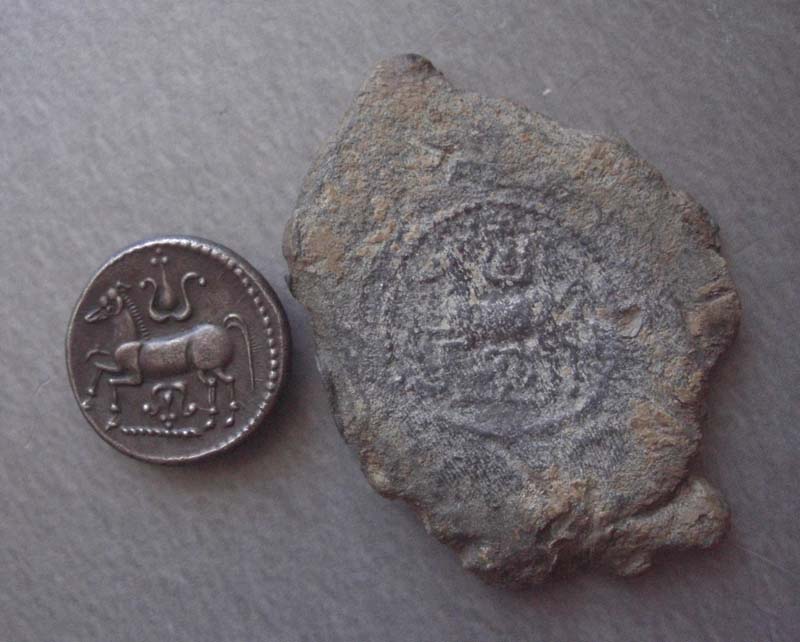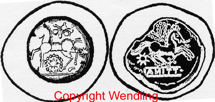 BLEIABSCHLAG 2 FORRER – Alsace...p. 69-72, fig. 72 alias Sch GB Sie 30, p.430-431, pl. IX / 233 Runde, ca 1,5-2,0 mm dicke Bleischeibe. Gewicht: 12,07 g.Durchmesser: 24 à 26 mm. Fundort: Saletis, jetzt Seltz im Unterelsass ca 218 km östlich von Trier gelegen. Nun im: Badischen Landesmuseum, Karlsruhe. Vs. erhabene Rs. des Staters der Treveri BN 8817: das ist also der Abschlag eines Stempels (Matrizze) Rs. hohle Rs. (spiegelverkehrt) von der Rs. des Staters der Treveri BN 8825: das ist also der Abschlag einer Patrizze. BLEIABSCHLAG 3 Gendre & Hollard in SENA N°159, 2004, p.35-38, fig.1 Bleiband. Länge ca 16 cm. Gefalten. Funstelle: bei Arras, ca 398 km westloch von Trier!!! Nun in Privatbesitz. Auf diesem Bleiband mehrere erhabene Abschläge der Vs. des Staters der Treveri BN 8825. Es können also Werkzeuge, die zur Prägung des selben Typs gedient haben 686 klm von einander gefunden werden! Das eine Werkzeug in einer Entfernung von 218 km von Trier, die wahrscheinslichstee Münzstätte, und das andere 398 km weg von Trier!!