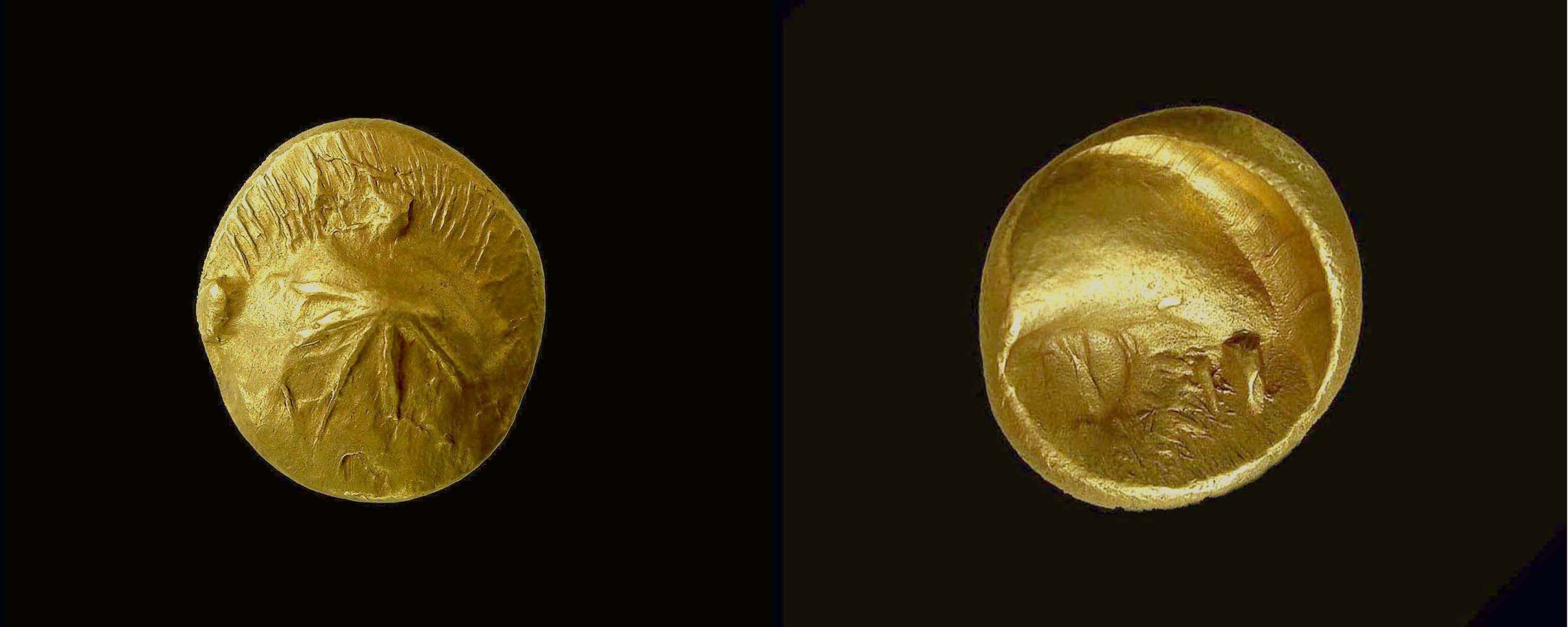 Das Aversbild dieser Münze besteht aus einem handförmigen Symbol, welches von einem Kranz aus feinen Strahlen umgeben ist. Etwa bei 2 Uhr und bei 5 Uhr befindet sich je ein kugelförmiges Zeichen.
