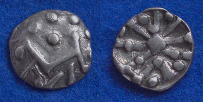 Die völlig aufgelösten Bilder zeigen auf dem Avers ein stilisiertes Pferd mit kugelförmigen Beizeichen und auf dem Revers ein geometrisches kreuzförmiges Motiv mit v- förmigen und kugelförmigen Beizeichen.