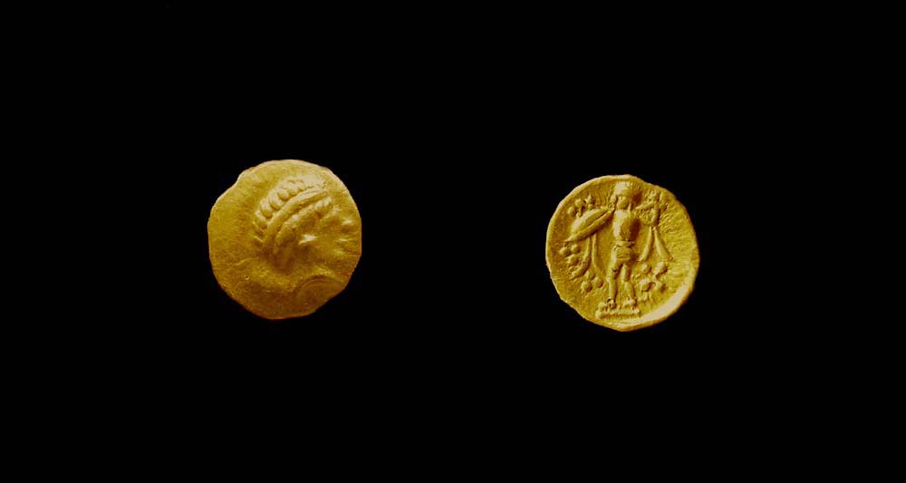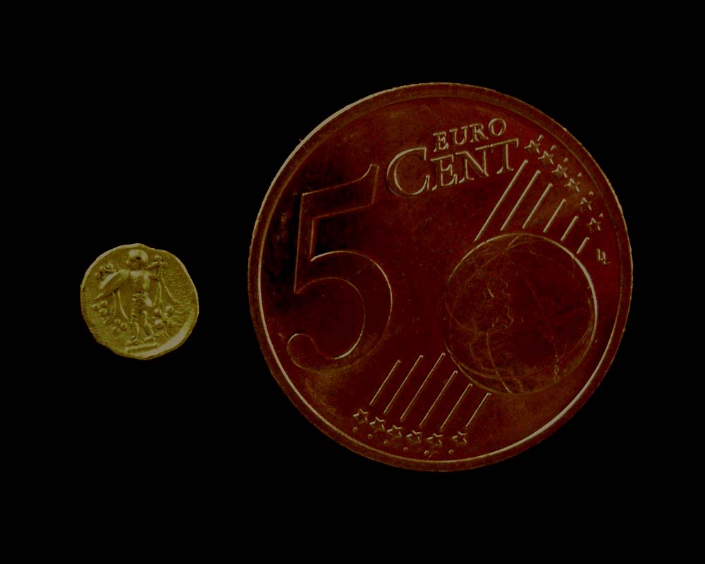 Diese äußerst winzige Abbildung ist ein schöner Nachweis für die außerordentliche Kunstfertigkeit der keltischen Stempelschneider, welche das Bild in einen eisernen Prägestempel geschnitten hatten.