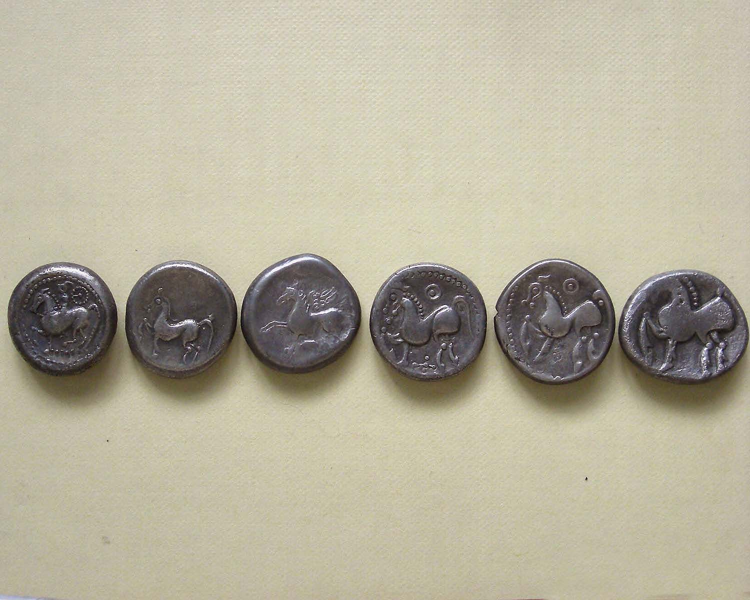 Daraus entstanden die Typen Ornamentreiter und Pegasus, wobei bei letztgenanntem Typ aus der Pferdedarstellung durch Stempelumschnitt jene eines Pegasus, oder Greifen entstand.
