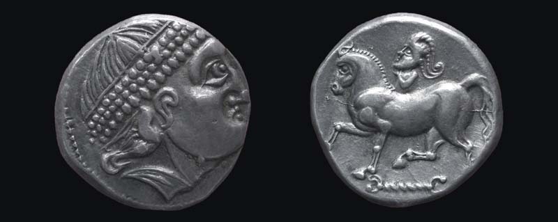 Der Stempelschneider schaffte es virtuos, ein Bild mit fast portraithaften Zügen und ein naturalistisch wiedergegebenes trabendes Pferd auf einem Stempel mit dem Ausmaß von lediglich 9 Millimetern unterzubringen.