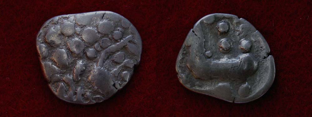 Der Revers zeigt ein ebenfalls sehr grob gezeichnetes stark stilisiertes Pferd nach links und darüber 4 Kugeln.