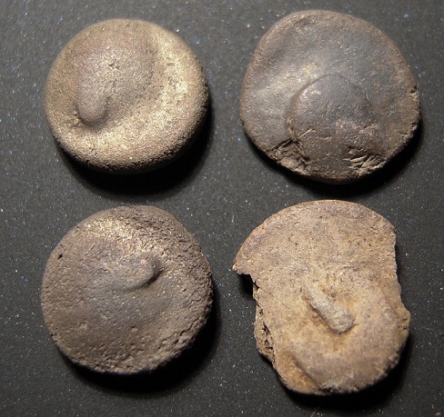 Erstmal die Daten zu den einzelnen Münzen (beginnend links oben, dann im Uhrzeigersinn): 1. d = 8mm, m = 0,52g 2. d = 8mm, m = 0,41g 3. d = 9mm, m = 0,30g (beschädigt) 4. d = 8mm, m = 0,35g