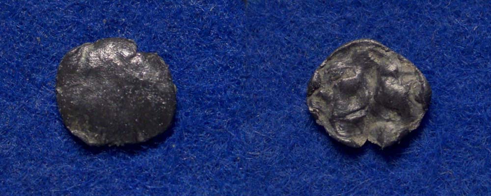 Das Teil hier könnte mit seiner Schüsselform, seinem Gewicht von 0,46g, dem Durchmesser von 7mm und seiner "Vergesellschaftung" mit diversen Obolen durchaus als eine zeitgenössische Bleifälschung eines keltischen Kleinsilbers durchgehen. Vom "Münzbild" ist korrosionsbedingt nicht mehr viel zu erkennen, mit eine wenig Fantasie und Optimismus könnte man aber durchaus ein Pferdchen nach rechts hineininterpretieren. Die Frage ist nur: Gab es sowas bei den Kelten?
