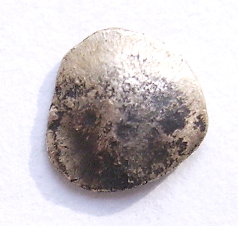 Die einseitige schüsselförmige Prägung zeigt auf der Innenseite ein Schnabel-Pferd, unter dem Pferd ein T, das Gewicht der Münze 0,39 g., der Durchmesser 7 mm. Von Größe und Gewicht her, hätte ich auf einen Obol der Boier getippt, so um 70 v.Chr., doch das Schnabelpferd und das T weisen wider Richtung der Ostkelten.