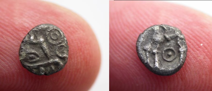 es handelt sich um eine Kleinsilbermünze der Atrebates, Van Arsdell 358-5, geprägt möglicherweise unter Commius. Vergleichsbeispiele findest Du unter: