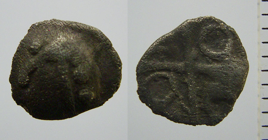 Am ehesten entspricht die Münze dem Typ "Kleinsilber mit Kreuz", Kellner, Manching 106 bzw. 787. Sie unterscheidet sich durch die einfachere Frisur und die Kugel vor der Nase. Von den Kleinsilbermünzen des Typs Dühren unterscheidet sie sich dadurch, dass auf Rückseite in zwei der Winkel nur jeweils ein Kringel ist, und nicht deren drei.