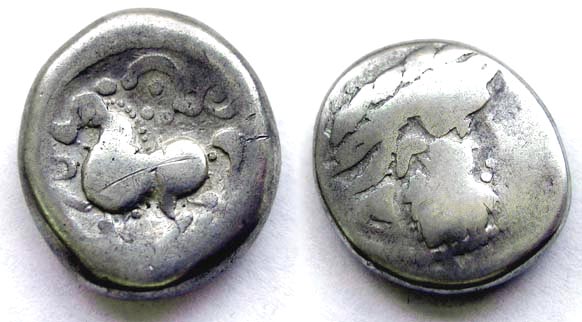 Eine Variante des Dachreitergepräges kann ich auch hier anreihen, zwar hat diese TDR nicht die Qualität von Haralds Stücken und man sieht dass das Münzlein schon einiges mitgemacht hat, aber sie hat trotzdem einen Fixplatz in meiner Sammlung, da sie die erste keltische Tetradrachme war die mir vor Jahren zugerollt ist: