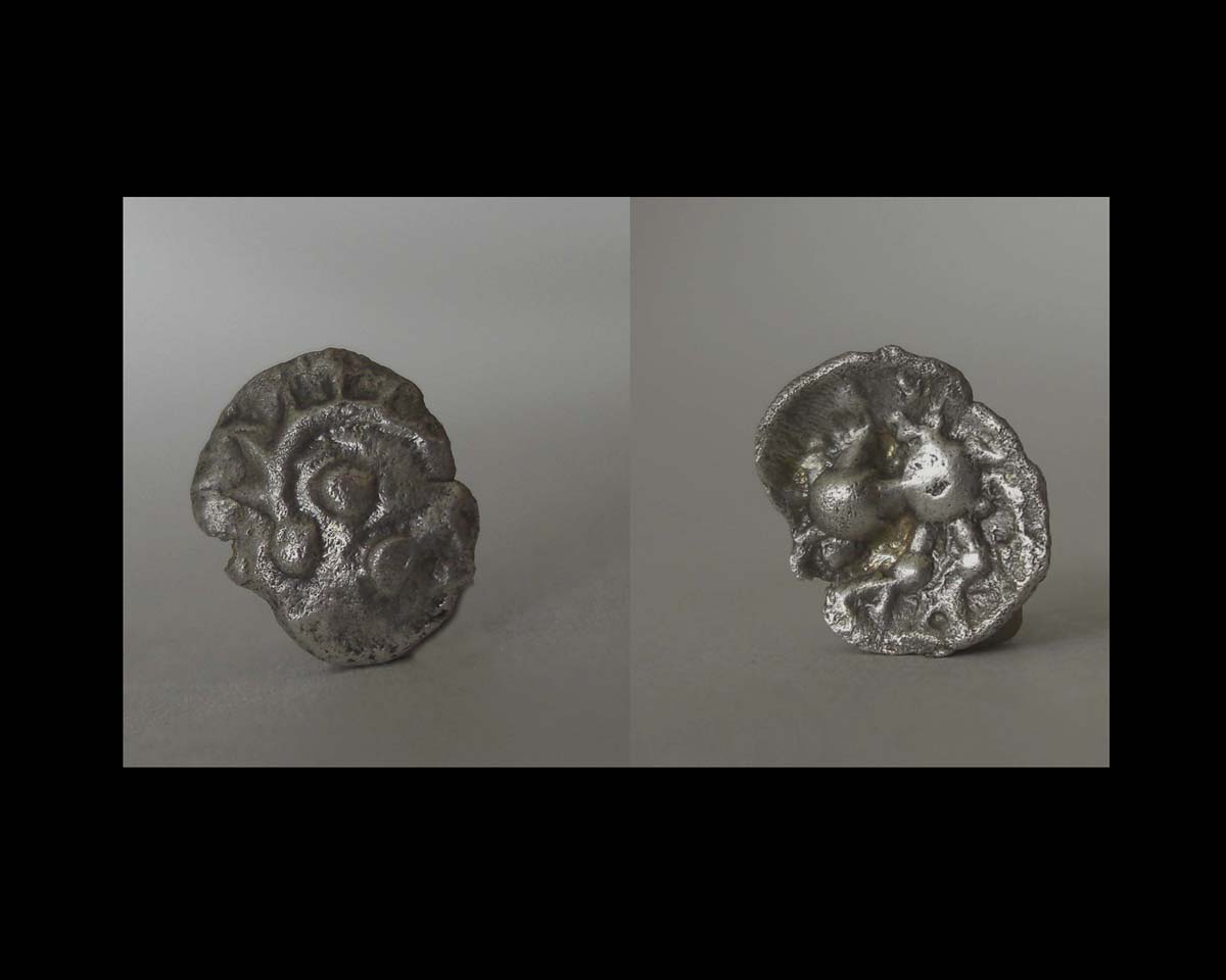 Av: Torques in 2 Kugeln endend mit Strahlenkranz, im Zentrum Kugel. Rv: Pferd mit Dreieckhufen und kleinem Kopf links.