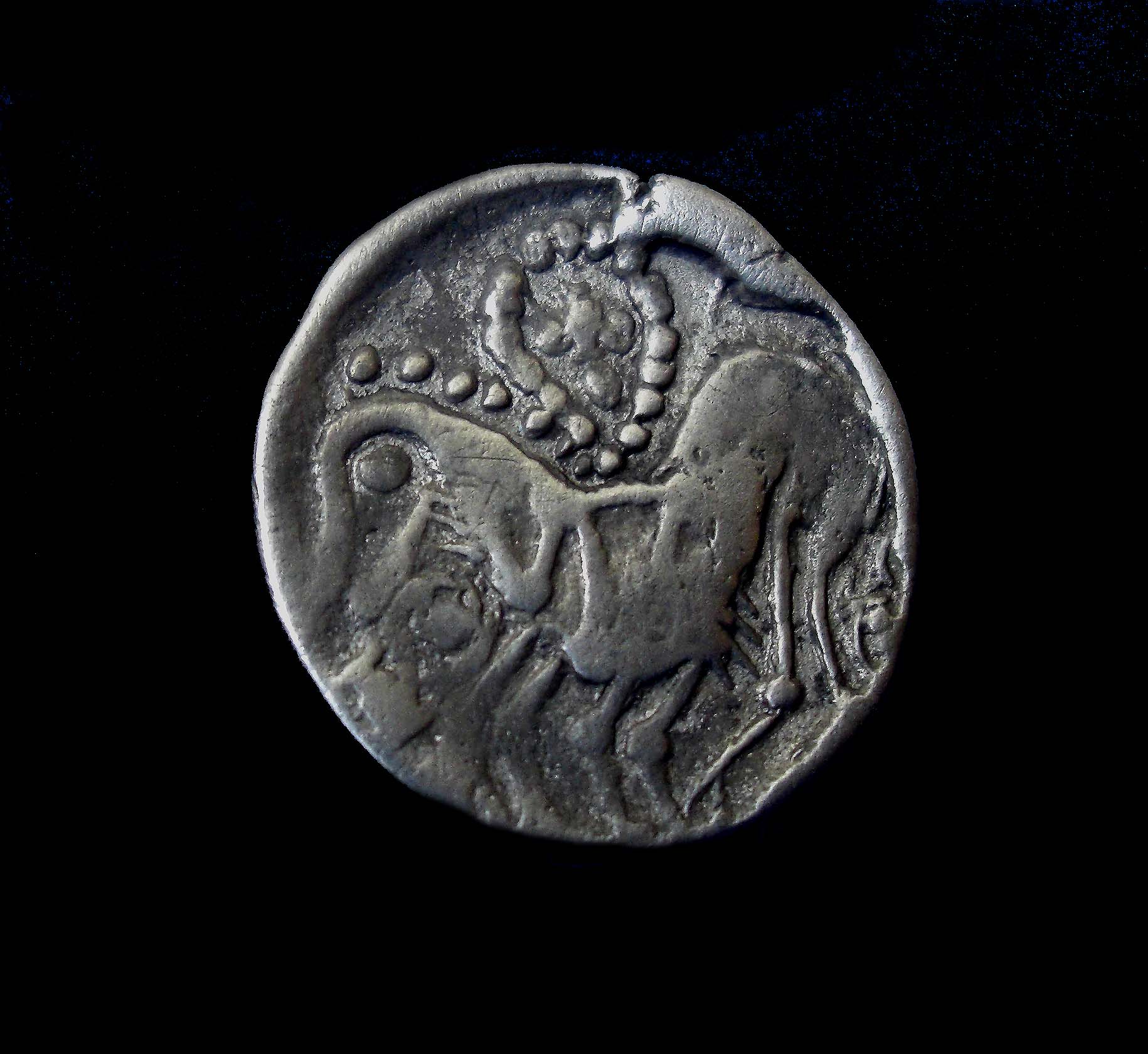 herzlichen Glückwunsch zu dieser Seltenheit! Die vier Striche unter dem Pferd erinnern mich spontan an die Darstellung der Pferde auf den Drachmen vom Typ Tótfalu mit allerdings nur drei Strichen unter dem Bauch. Auch der Kopf ähnelt dem einger Tótfalu-Pferde. Allerdings hat das Pferd bei Deiner Münze eine Art "Bart" und der Körper ist durch Stege gegliedert. Hat das Pferd fünf Beine? Je länger man guckt, desto mehr Besonderheiten entdeckt man.
