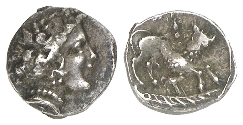 AR-Obol, 3./2. Jahrhundert v. Chr.; 0,78 g. Frauenkopf r.//Gehörnter Vierfüßer l., darüber vier Punkte. BMC vergl. 33 ff.