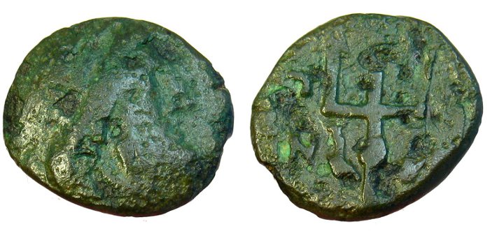 Die folgende Bronze traue ich mich eigentlich kaum zu zeigen, so schlecht ist sie erhalten, aber ich tue es dennoch, weil sie so selten ist: Es ist nämlich eine Münze der Kykladeninsel Tenos, die sind nicht häufig und dieser Typ schon gar nicht.