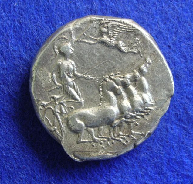 Meine Münze ist mit der aus Coinarchives wohl auf der Quadrigaseite stempelgleich. Den Kranz, den Nike dem Wagenlenker bringt, sieht man bei mir nur teilweise, da hier wohl beim Guß des Schrötlings eine kleine Metallnase wegstand, die beim Prägen auf die Münze draufgeklopft wurde und später abbrach.