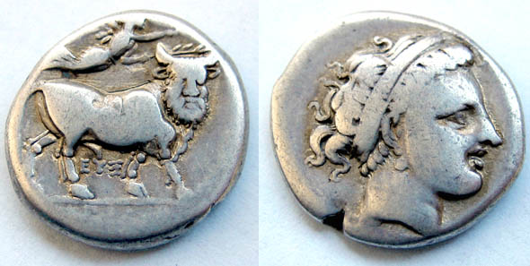 Rv. androkephaler Stier rechts, darüber schwebende Nike mit Kranz EYΞ