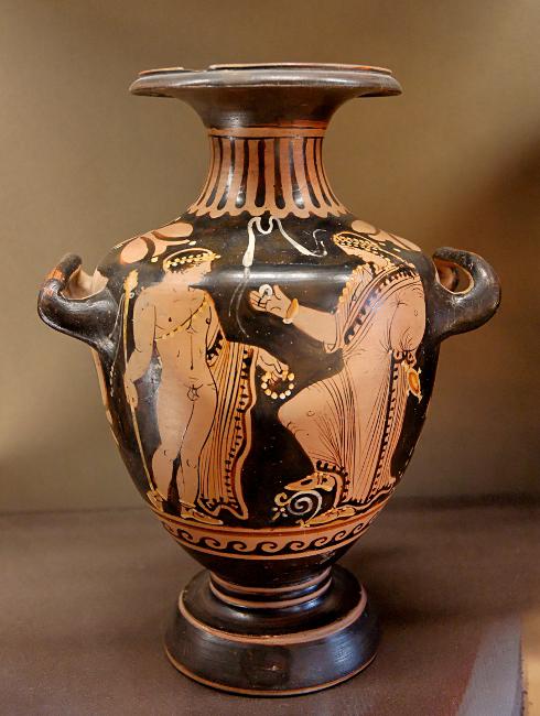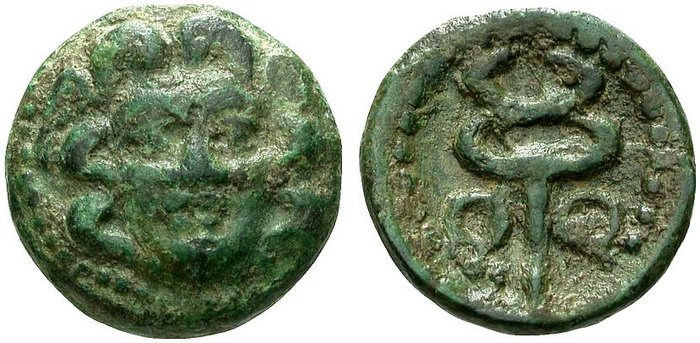 http://de.wikipedia.org/wiki/KausiaDas Gefäß auf der Rückseite wird gewöhnlich als Hydria angesprochen. Eine Hydria ist ein Wassergefäß. Auf dieser Münze ist es aber eher ein Volutenkrater (wiewohl es auch Münzen dieses Typs gibt, die eher eine Hydria abbilden). Ein Krater aber war ein Gefäß, dass eher dem Transport von Wein diente. Antigonos von Karystos berichtet, dass in Zeiten der Trockenheit eine Hydria in einer Prozession auf einem Streitwagen durch die Stadt (oder die Felder) gefahren und Apollo (oder auch Zeus) um Regen angefleht worden sein soll. Ob es wahr ist oder nicht, wer weiß... Jedenfalls sieht das Gefäß eher aus wie ein Weingefäß und ein Streitwagen sollte auch nur eine Achse haben. Also: künstlerische Freiheit der Stempelschneider oder doch ein anderer Mythos?