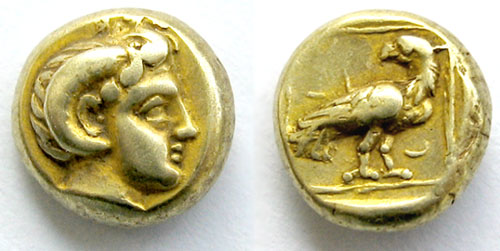 Lesbos Mytilene, Electrum Hekte, geprägt um ca. 330 v.u.Z Av. Apollon Karneios mit Widderhorn rechts Rv. Adler steht rechts den Kopf zurückgewandt in Quadratum Incusum 11,3mm 2,53g Bodenstedt 303 Boston 1739 SNG von Aulock 1727 Ex: Gerhard Rohde Köln