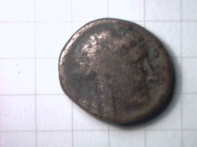 seit langer Zeit versuche ich verzweifelt, eine kleine Bronzemünze zu bestimmen. Der schlechte Erhaltungsgrad macht es nicht leichter. Auf der Vorderseite ist ein Kopf mit Schleier zu erkennen (Apollon?), auf der Rückseite ist ein Dreibein mit einer Figur (ebenfalls Apollon?). Seitlich steht etwas geschrieben, aber es kann Latein oder Griechisch sein. Gewicht 2,95g. Material Bronze.