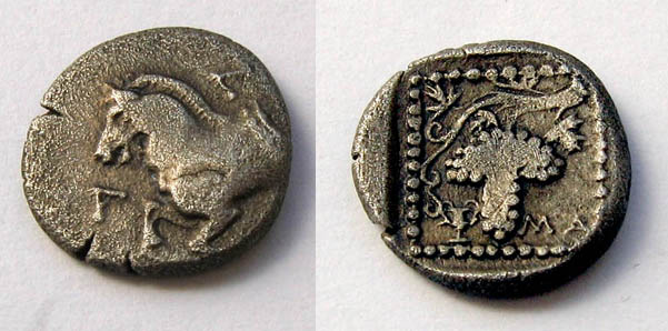 Maroneia, und jetzt bewegen wir uns wieder mehr in Richtung klassische Antike, war ein bedeutendes Weinanbaugebiet und als solches sicher auf im Export führend. Viele Münzen von Maroneia (wie die schon hier vorgestellten) haben einen Bezug zum Weinbau und der dazugehörigen Verehrung des Dionysos.