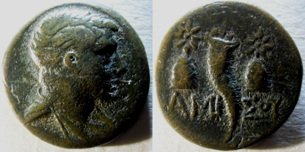 Derselbe Typ aus Amisos. Dieselbe Stadt gehörte ab etwa 300 v. Chr. oder wenig später zum Königreich Pontos. König Mithridates VI. (132-63 v. Chr.) residierte zeitweilig in der Stadt. Im ersten Mithridatischen Krieg gegen die Römer wurde sie vom römischen Feldherrn Lukullus nach einer Belagerung erobert. In der Spätantike war sie Sitz eines Bischofs.