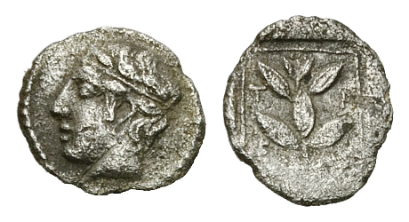 Av.: belorbeerter Kopf des Apollon n. li. im Perlkreis.
