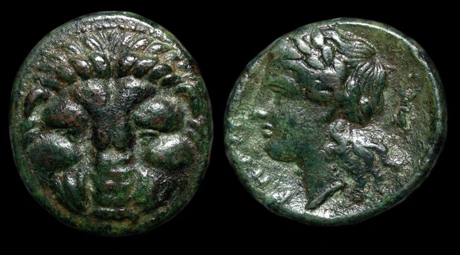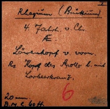 Rhegion / Rhegium vorstellen, deren Münzbild im Avers einen imposanten Löwenkopf in Frontalansicht zeigt - eine Art Kennung für die Münzen dieser Stadt.