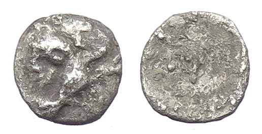 Völlig ratlos bin ich bei diesem Stück, das gewichtsmäßig zwischen einem Tetartemorion und einem Trihemitartemorion liegt mit 0,22 g.